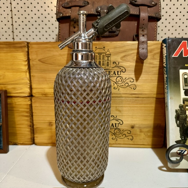 c1930 original Sparklets, London soda siphon in wonderful condition and of considerable weight! These are stunning quality and wonderful display pieces from a bygone era of style, fashion and chic design. The main glass is encased in steel triangular designed wire that is beautifully done and very stylistic.